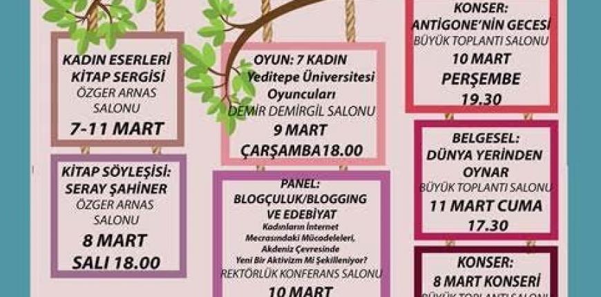 BÜ’de Kadın Şenliği 9 Mart Çarşamba akşamı Yeditepe Üniversitesi Oyuncuları’nı “7 Kadın” isimli oyunla tiyatro severlerle buluşturacak. Oyun 18.00’da Demir Demirgil Salonu’nda başlayacak. 10 Mart Perşembe günü 16.30’da blogçuluk ve edebiyat üzerinden internetteki kadın mücadelelerinin tartışılacağı panelde İspanya, Tunus, Mısır, Suriye ve Türkiye’de yaşayan kadın blog yazarları bir araya geliyor. Panelin ardından Akdeniz ülkelerinde yaşayan kadınların yaşamlarına ışık tutan bir konser projesi olan Antigone’un Gecesi Albert Long Hall’da sahne alacak.