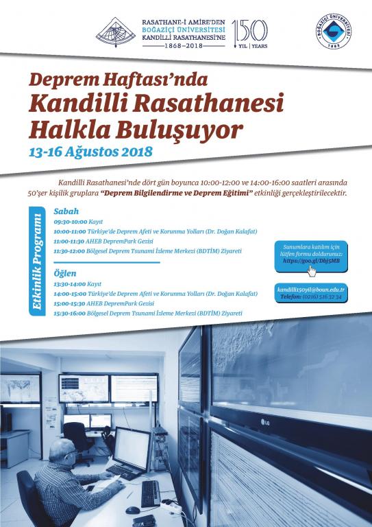 Her yıl 17 Ağustos depreminin yıl dönümünde deprem tehlike ve riski konusunda farkındalık yaratmak üzere etkinlikler düzenleyen Boğaziçi Üniversitesi Kandilli Rasathanesi’nin 13-16 Ağustos Deprem Haftası 150. Yıl Etkinliklerine katılmak isteyenler https://goo.gl/Dbj5MB adresindeki formu doldurarak veya kandilli150yil@boun.edu.tr adresine e-posta göndererek programa kayıt olabilecekler.