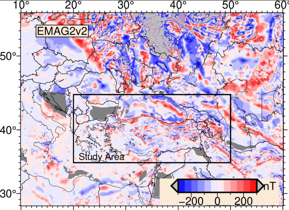 Türkiye ve civarını içeren bölgenin uydu gözlemleri ile tamamlanmış manyetik anomali haritasında da göreceğiniz üzere, bizim ilgilendiğimiz anomaliler +/- 300 nT arasında değişiyor.