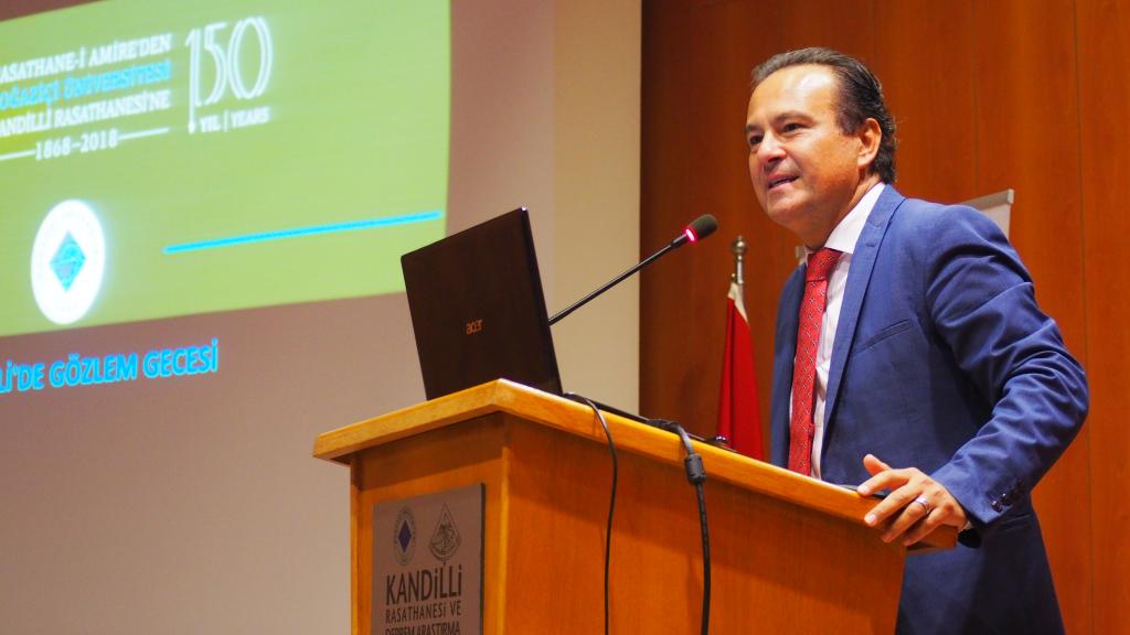 Rasathane’nin 150. Yıl etkinlikleri kapsamında düzenlenen gecede, açılış konuşmasını Boğaziçi Üniversitesi Kandilli Rasathanesi ve Deprem Araştırma Enstitüsü Müdürü Haluk Özener gerçekleştirerek kötü hava şartlarına rağmen salonu dolduran misafirlere teşekkür etti. Özener’in ardından söz alan Prof. Dr. Orhan Gölbaşı, Ortaçağ’dan günümüze astronomi tarihini ve İslam dünyasının astronomiye katkılarını anlattığı bir sunum gerçekleştirdi. Osmanlı İmparatorluğu ve öncesinde gözlem yapmak için kullanılan aletlerin fotoğraflarına da sunumunda yer veren Gölbaşı, Kandilli Rasathanesi’nin Fatin Gökmen öncülüğündeki kuruluş sürecini dinleyicilerle paylaştı. Gölbaşı, Güneş’in yapısı ve özelliklerini anlattığı sunumunda Kandilli Rasathanesi’nin Güneş gözlemlerini her gün gerçekleştirdiğine dikkat çekti.