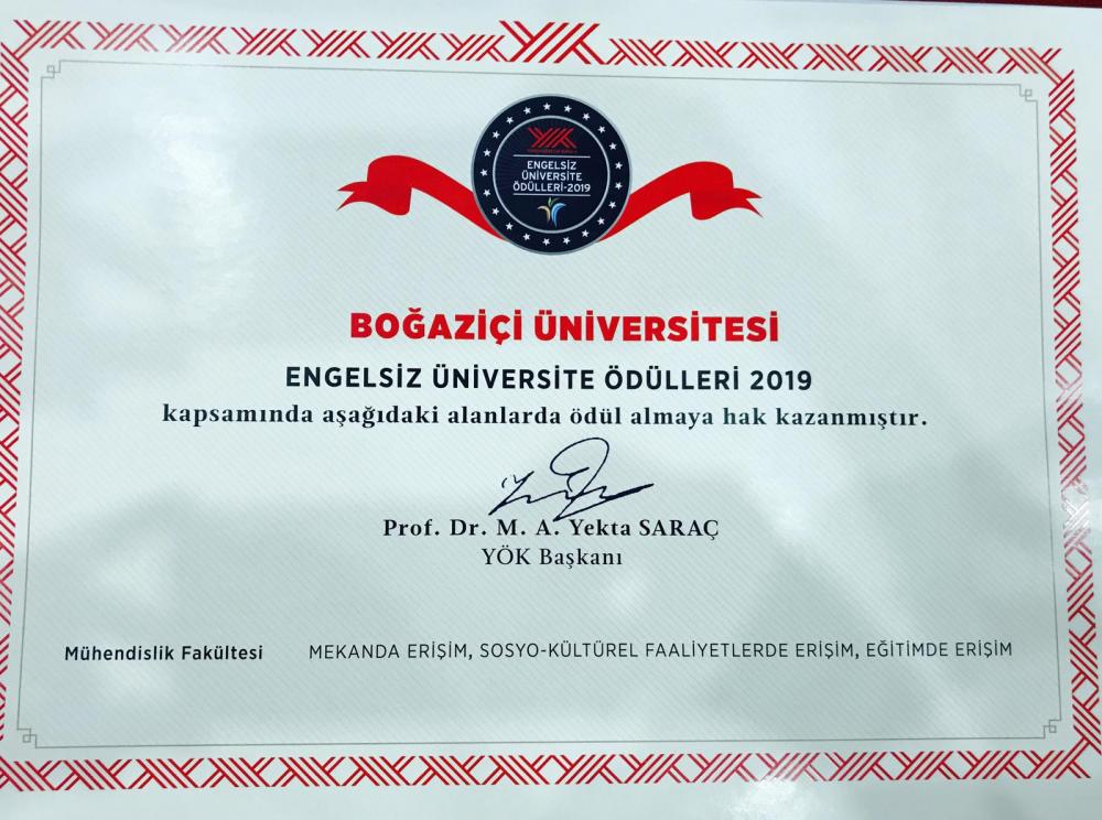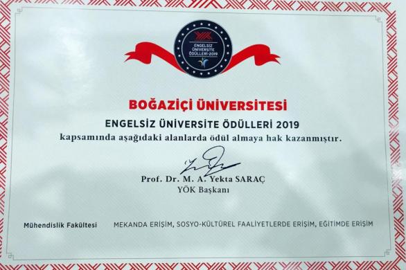 Engelli öğrencilerin eğitim öğretim faaliyetlerine olduğu kadar sosyal ve kültürel faaliyetlere de erişebilmesini sağlamak üzere gerekli uyarlamaların, alt yapının ve donanımların sağlanmasına yönelik engelsiz bir ekosistemin oluşturulmasını teşvik etmek üzere Yükseköğretim Kurulu tarafından verilmekte olan Engelsiz Üniversite Ödülleri’nde Boğaziçi Üniversitesi Mühendislik Fakültesi “Mekânda Erişim,” “Sosyo-Kültürel Faaliyetlerde Erişim,” ve “Eğitimde Erişim” alanlarında ödüllendirildi.