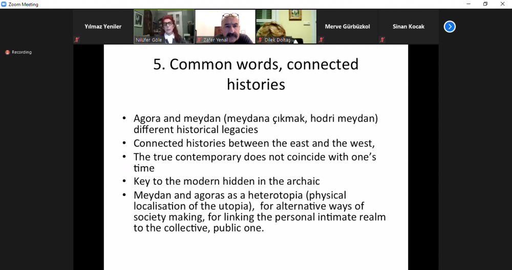 Modern öncesi dönemde agoralar üzerinden tanımlanabilecek kamusal alanın, modern dönemde Habermas’ın ifade ettiği kamusal alana dönüşmesinden sonra bugünün toplumunda kamusal alanın üçüncü bir aşamaya girdiğini belirten Nilüfer Göle, bu üçüncü aşamanın kamusal alandan geri çekilme ya da kamusal alanın aşınması şeklinde yorumlanabileceğini ifade etti. Kamusal alanı aşındıran güçleri; salgınlar, terör saldırıları, Agamben’in tartıştığı olağanüstü haller ve yalan haberler olarak sıralayan Göle, konuşmasına şu cümlelerle devam etti: “Özellikle sanal iletişimin hâkim olduğu pandemi günlerinde kamusal hayata erişimimiz azaldı. Çalışma alanları, toplu taşımalar, restoranlar, kafeler, tiyatrolar ve sinemalar gibi sosyalleşme alanlarının askıya alındığını hissediyoruz. Kamusal alanı aşındıran bir diğer unsur ise son yıllarda dünyanın farklı yerlerinde deneyimlenen terör saldırıları. Bu saldırılar, belli toplanma noktalarını hedef aldığından kamusal alanın, hayatı tehlikeye düşüren alan şeklinde algılanmasına yol açıyor. Kamusal alanı aşındıran bir başka faktör olağanüstü haller. Ayrıca yalan haberler, kamusal alanda sağlıklı tartışma yürütmeyi zorlaştıran bir etken.”