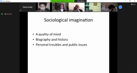 Prof. Dr. Nilüfer Göle, “Contemporary Agoras and Performative Citizenship / Çağdaş Agoralar ve Performatif Vatandaşlık” başlıklı konuşmasına C. Wright Mills’in kavramsallaştırdığı sosyolojik tahayyülü tanımlayarak başladı. Sosyologların kendilerini toplumda nasıl konumlandırdıklarına göre araştırma konularını seçtiklerine değinen Nilüfer Göle; Cornelius Castoriadis, Alain Touraine Charles Taylor gibi isimlere referansla toplumun kendi kendisini yaratması ve dönüştürmesi meselesiyle akademik olarak nasıl ilgilenmeye başladığını açıkladı.
