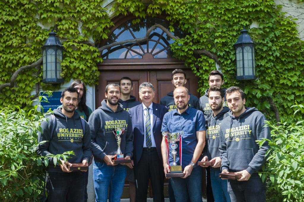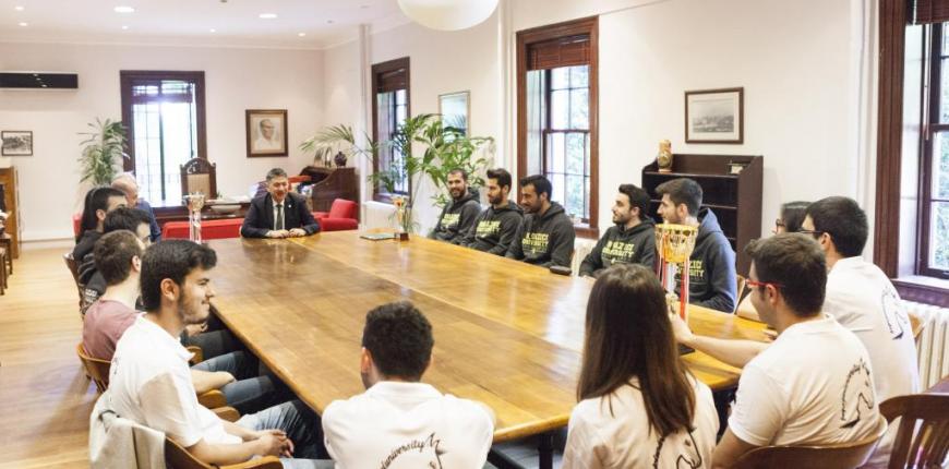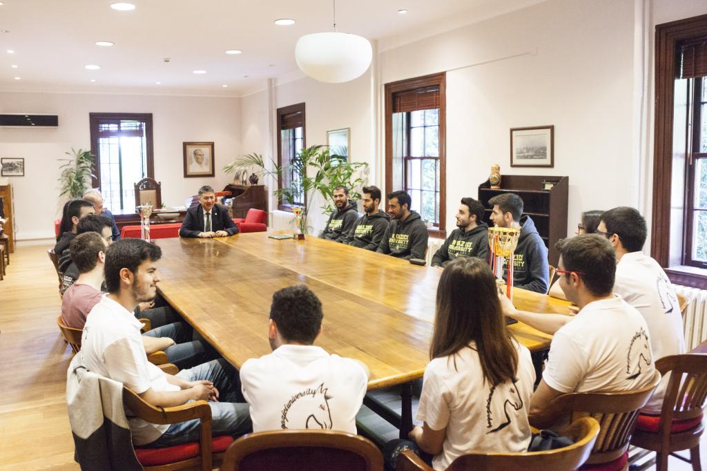 Boğaziçi Üniversitesi Satranç ve Erkek Basketbol Takımları, Boğaziçi Üniversitesi Rektörü Prof. Dr. Mehmed Özkan’ın konuğu oldu. Rektörlük Binası’nda şampiyon sporcularla görüşen Özkan, “Sizlerle gurur duyuyoruz. Bizleri çok mutlu ettiniz. Sizin başarılarınız bize de motivasyon sağlıyor,” ifadelerini kullandı. Sporcuların ziyareti, gerçekleşen sohbetin arından Özkan’ın sporculara hatıra plaketlerini vermesi ve Satranç Takımı sporcusu Çağla Yaren Aslan ile sembolik bir satranç maçı oynaması ile sona erdi.