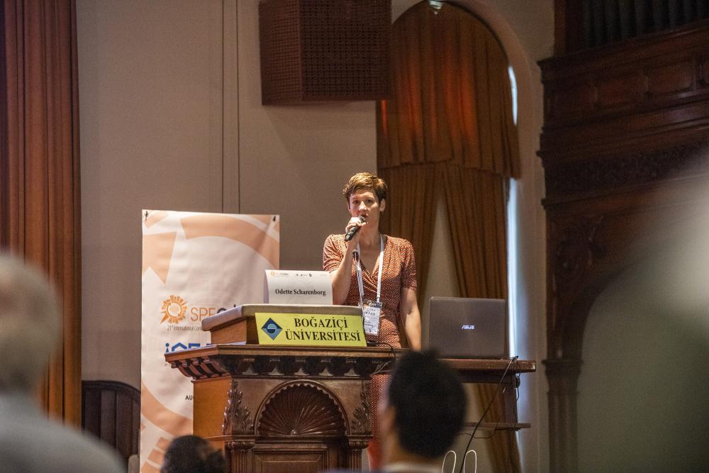 Konferansın üçüncü açılış konuşmasını gerçekleştiren Hollanda Delft Teknoloji Üniversitesi öğretim üyesi Doç. Dr. Odette Scharenborg, “The Representation of Speech In The Human and Artifical Brain” başlığıyla bilişsel modellerin konuşma tanımaya uygulanması konusundaki çalışmaları aktardı. Konuşmanın insan beyninde ya da yapay beyinde nasıl temsil edileceği sorusunun iki temel alanda araştırıldığını belirten Doç. Dr. Scharenborg, insanlar ve makinelerle yapılan deneylerim sonuçlarından örnekler sundu. Deney sonuçlarına göre hem insan dinleyicilerin hem de makinelerin yeni bir sesle karşılaştıklarında mevcut ses kategorilerini adapte etme ihtiyacı duyduklarını ifade eden Scharenborg, insan dinleyicilerin bu işlemi daha hızlı gerçekleştirdiklerinin gözlemlendiğini aktardı.