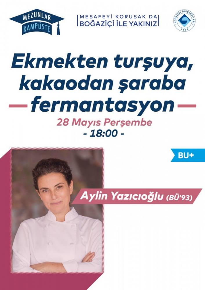 “Mezunlar Kampüste” etkinliklerinin bu haftaki konuğu ünlü şef Aylin Yazıcıoğlu (BÜ’93) oldu. 28 Mayıs’ta Zoom üzerinden gerçekleşen ve 170’ten fazla dinleyicinin katıldığı etkinlikte Aylin Yazıcıoğlu, “Ekmekten turşuya, kakaodan şaraba” başlığını taşıyan konuşmasıyla uygulamalı olarak fermantasyon hakkında ilginç tüyolar verdi.