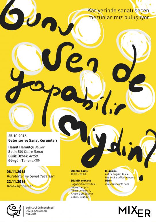 Boğaziçi Üniversitesi Güzel Sanatlar Kulübü ve Mixer’in işbirliğiyle dört oturumdan oluşan “Bunu sen de yapabilir miydin?” konferanslar serisi başladı. Toplantı dizisi kapsamında görsel sanatların farklı alanlarında çalışan Boğaziçili mezunlar öğrencilerle bir araya geliyor. Boğaziçi mezunu sanatçılar, sanat kurumlarında çalışanlar, küratörler ve koleksiyonerlerin katılacakları seminerler dizisinin ilki geçtiğimiz günlerde sanatçılara yer verdiği oturumla düzenlendi.