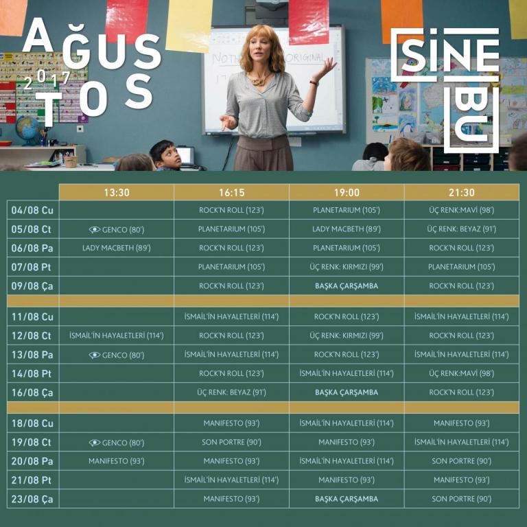 Ağustos'ta SineBU’da yaz boyunca kaçırdığınız filmleri sınırlı sayıda seansla da olsa telafi edebilirsiniz. KEDİ, ROCK’NROLL, LADY MACBETH, PLANETARIUM, MAVİ, BEYAZ, KIRMIZI için son seanslar. Ayrıca hala izlemediyseniz sesli betimleme seçeneği ile GENCO vizyonda olacak.