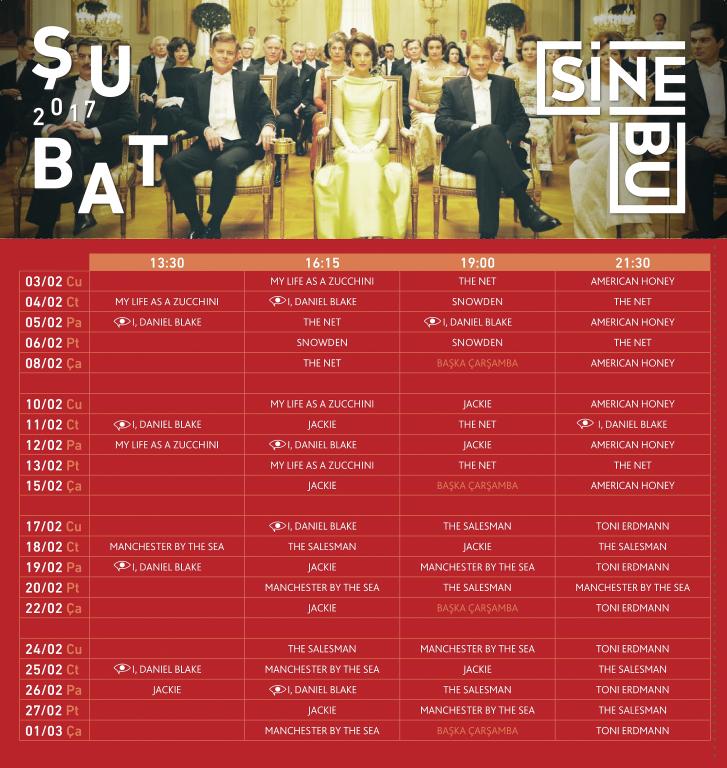 Boğaziçi Üniversitesi Sinema Salonu SineBU, eleştirmenlerden övgüler almış; festivallere damga vurmuş, merakla beklenen çok sayıda önemli filmi Şubat ayında İstanbullu sinefiller için sunuyor. Bu ay Jackie, The Salesman, American Honey, Manchester by the Sea gibi önemli yapımlar gösterime giriyor. Bol ödüllü filmlerin yanı sıra Ken Loach’ın Altın Palmiye ödüllü filmi ‘’I, Daniel Blake’’ sesli betimleme ile SineBU perdesinde sinemaseverlerle buluşuyor.