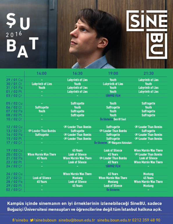 Yeni vizyon filmlerinin yanı sıra Altın Küre ve Oscar’ın çok konuşulduğu bugünlerde, SineBU’da daha önce gösterilmiş olan ve Oscar adaylıkları bulunan The Look of Silence, When Marnie Was There, Mustang ve 45 Years Şubat ayında arka arkaya yeniden perdeye taşınıyor. Ayrıca Rüzgarın Hatıraları filmini kaçıranlar için 17 Şubat’ta 19.00’da bir ek gösterim olacak, ajandalarınıza not etmeyi unutmayın!