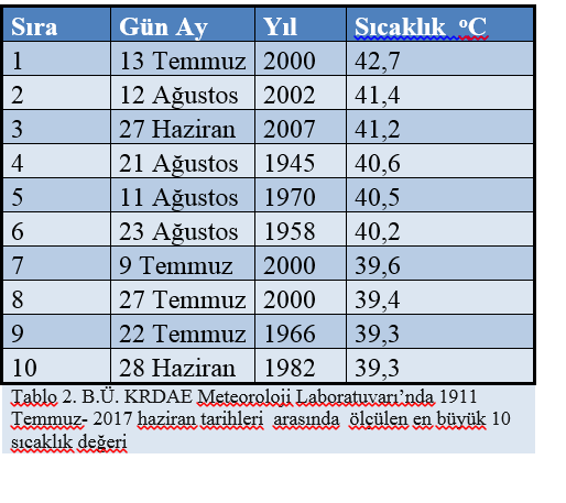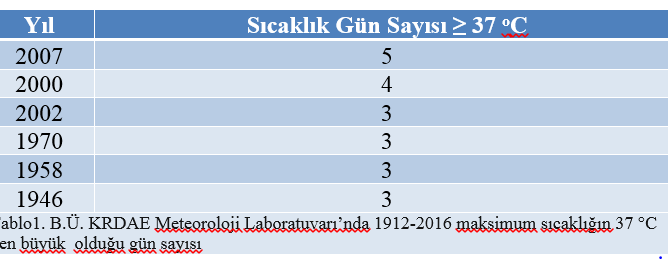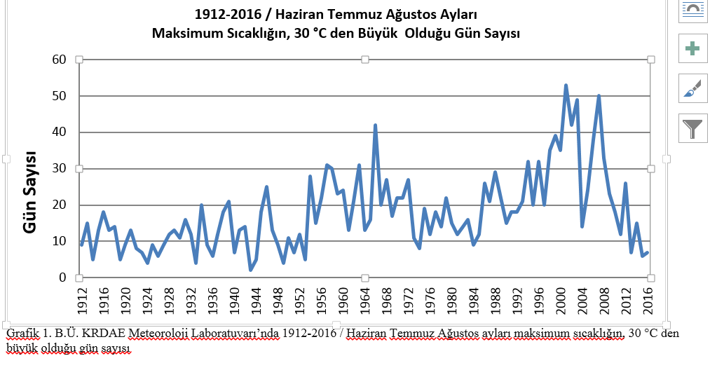 Bunu maksimum sıcaklık kayıtlarımızın analiz edildiği grafiğe baktığımızda rahatlıkla görebiliyoruz. Haziran Temmuz ve Ağustos ayları için maksimum sıcaklığın 30 C nin üstüne çıktığı “Tropikal Gün” olarak adlandırdığımız günler sayısı son onlu yirmili yıllara doğru yükselen bir eğim gösteriyor. Özellikle 1998-2003 arası ve 2007 yıllarında sıcak hava dalgalarına sıklıkla rastlanılmış durumda. 2001 yılında bu değer 53 güne çıkmıştır. (Bkz. Grafik 1)