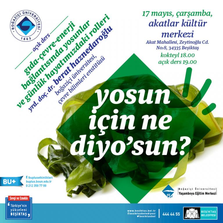 2017 Bahar döneminde Beşiktaş Belediyesi işbirliği ve Boğaziçi Üniversitesi Yaşamboyu Eğitim Merkezi (BÜYEM) desteği ve Yaşam Bilimleri ve Teknolojileri Uygulama ve Araştırma Merkezi’nin katkılarıyla sürdürülen “Bilimden Yaşama, Yaşamdan Bilime” başlıklı Açık Ders dizisinin 2017 Bahar döneminin son dersi Yrd. Doç. Dr. Berat Haznedaroğlu’nun sunumu ile 17 Mayıs Çarşamba günü Akatlar Kültür Merkezi’nde saat 19.00’da gerçekleştirildi. Haznedaroğlu, mikroyosun laboratuvarında yürüttükleri çalışmalar üzerinden yosunların gündelik yaşamımızdaki önemini anlattı.