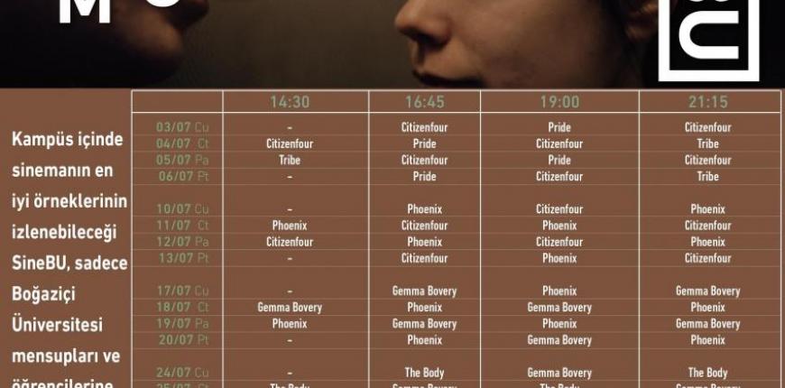 Temmuz programı açılışını 3 Temmuz tarihinde bu yıl “En İyi Belgesel” dalında Oscar alan “Citizenfour” ile yapacak olan SineBU, ay boyunca altı filmden oluşan bir seçkiyi sinemaseverlere sunuyor.