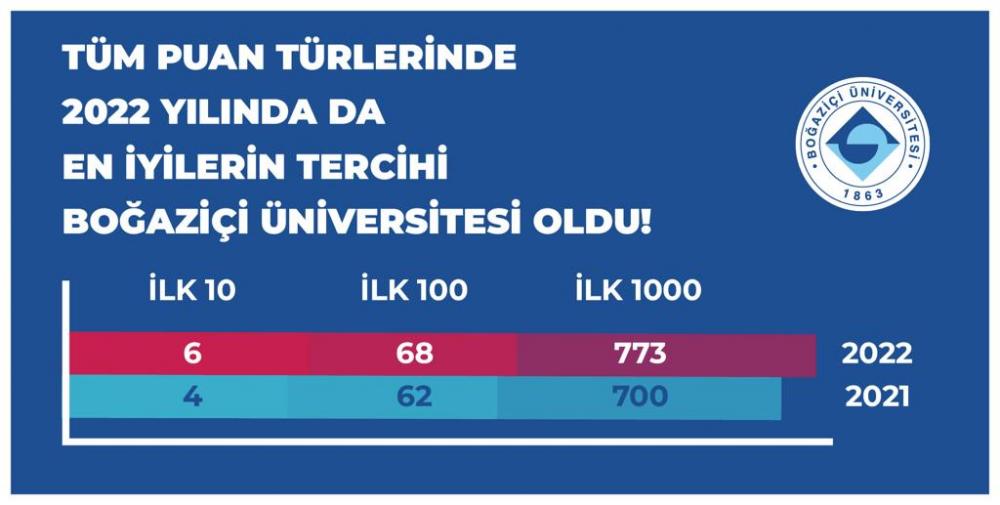 Boğaziçi Üniversitesi YKS sonuçlarına göre en başarılı öğrencilerin tercih listesinde ilk sıralarda yer alarak liderliğini sürdürüyor. Bu yıl tüm puan türleri toplamında ilk 10 öğrencinin 6’sı Boğaziçi Üniversitesi öğrencisi oldu. Aralarında Eşit Ağırlık birincisi Selin Aşıkiraz’ın da bulunduğu 6 öğrenci Ekonomi, İşletme, Sosyoloji, Bilgisayar Mühendisliği ve Endüstri Mühendisliği Bölümlerine yerleşti. Bu sayı 2021 yılında 4 olmuştu. Yine tüm puan türlerinde ilk 100 adayın 68’i Boğaziçili oldu. Bu sayı geçtiğimiz yıl 62’ydi. İlk 500 adaya bakıldığında ise 387 öğrencinin Boğaziçi Üniversitesi’ne geldiği görüldü. Tüm puan türlerinde ilk 1000 adaydan 773’ü Boğaziçi Üniversiteli olurken, bu sayı 2021 yılında 700’dü.