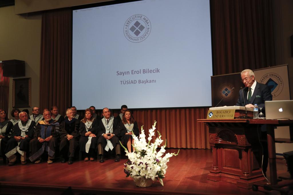 Boğaziçi Üniversitesi Executive MBA Yüksek Lisans Programı’nın 15. Mezuniyet Töreni’ne katılan TÜSİAD Yönetim Kurulu Başkanı Erol Bilecik, Türkiye ve dünyanın ekonomik panoramasını değerlendirdi ve yeni mezunlara liderlik konusunda önemli tavsiyeler verdi.