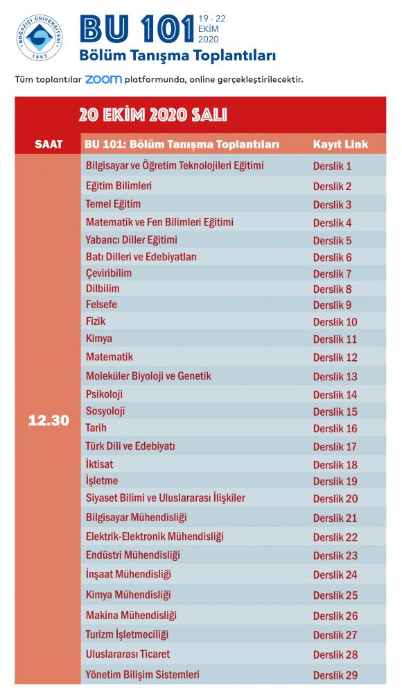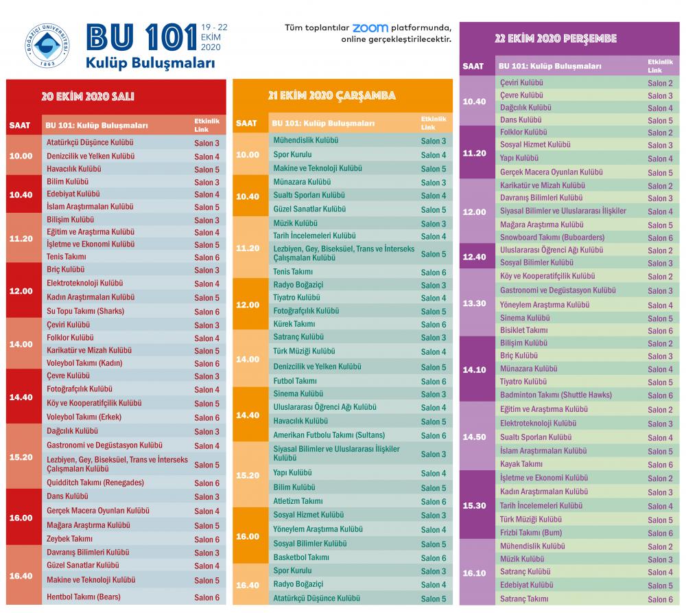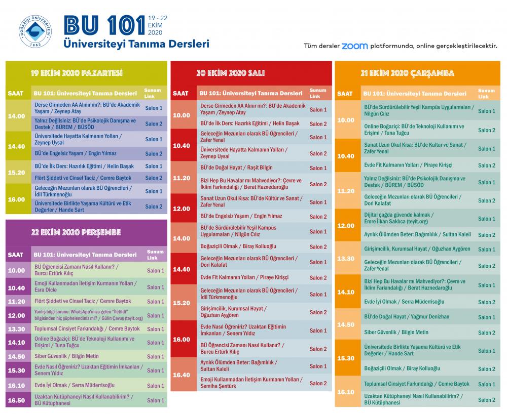 Salgın önlemleri nedeniyle Güz Dönemi derslerinin büyük oranda çevrim içi yürütülmesi kararı alınmış olsa da Boğaziçi Üniversitesi yeni öğrencilerini karşılamayı unutmadı. Tümüyle online yürütülecek “BÜ 101: Üniversiteyi Tanıma Dersleri” ve öğrenci kulüpleri ve idari birimlerin stantlarının yer alacağı “Sanal Fuar”dan oluşan Üniversiteyi Tanıma Günleri 19-22 Ekim 2020 tarihleri arasında düzenlenecek.